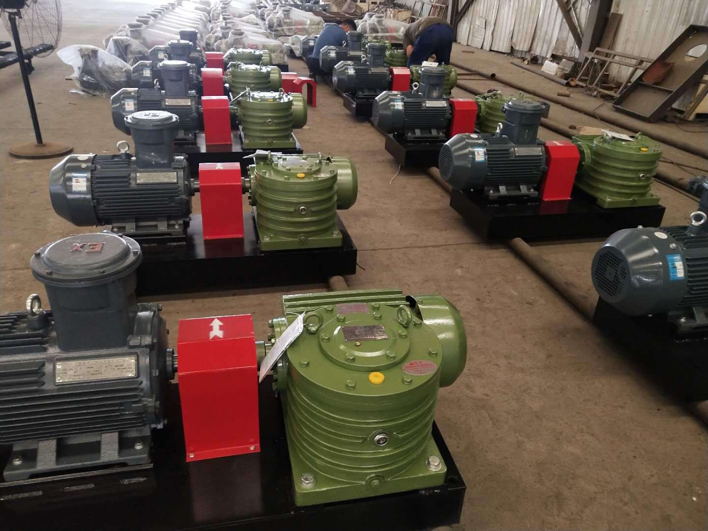 泥漿攪拌器根據(jù)減速機可分為: 蝸輪蝸桿減速機型攪拌器、齒輪減速機攪拌器、平面包絡(luò)減速機攪拌器及小型的擺線針輪攪拌器。 泥漿攪拌器主要由防爆電機,減速器,機座及波輪組件組成,電機與減速器,減速器與波輪軸均通過剛性聯(lián)軸器相連接。波輪由4只葉片組焊而成。